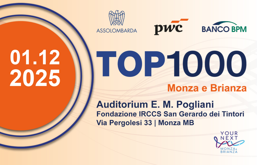 Lunedì 1 dicembre 2025 alle ore 17.15 (accrediti ore 16.45) si terrà presso l'Auditorium E. M. Pogliani la nuova edizione di TOP 1000 Monza e Brianza, l’appuntamento annuale che fornisce una panoramica delle realtà imprenditoriali della provincia di Monza e Brianza, con una visione prospettica sugli andamenti economici e sulle prossime sfide. Nel corso dell'evento, organizzato da Assolombarda, in collaborazione con PwC Italia, Banco BPM e Il Cittadino di Monza e Brianza, verranno presentati i dati della ricerca a cura del Centro Studi di Assolombarda sulle prime 1000 imprese della provincia. L’incontro sarà inoltre l’occasione per approfondire insieme a istituzioni, associazioni e imprenditori locali le sfide e le opportunità legate alla capacità delle aziende di trattenere i talenti e attrarre le nuove generazioni in un mercato in continua evoluzione e le strategie per rendere il territorio sempre più attrattivo, competitivo e capace di valorizzare il capitale umano. La partecipazione è gratuita previa registrazione. Per iscriversi all’evento cliccare qui.